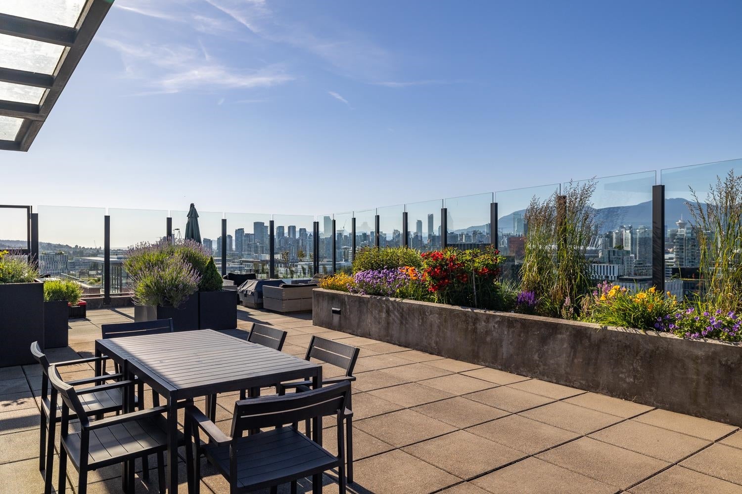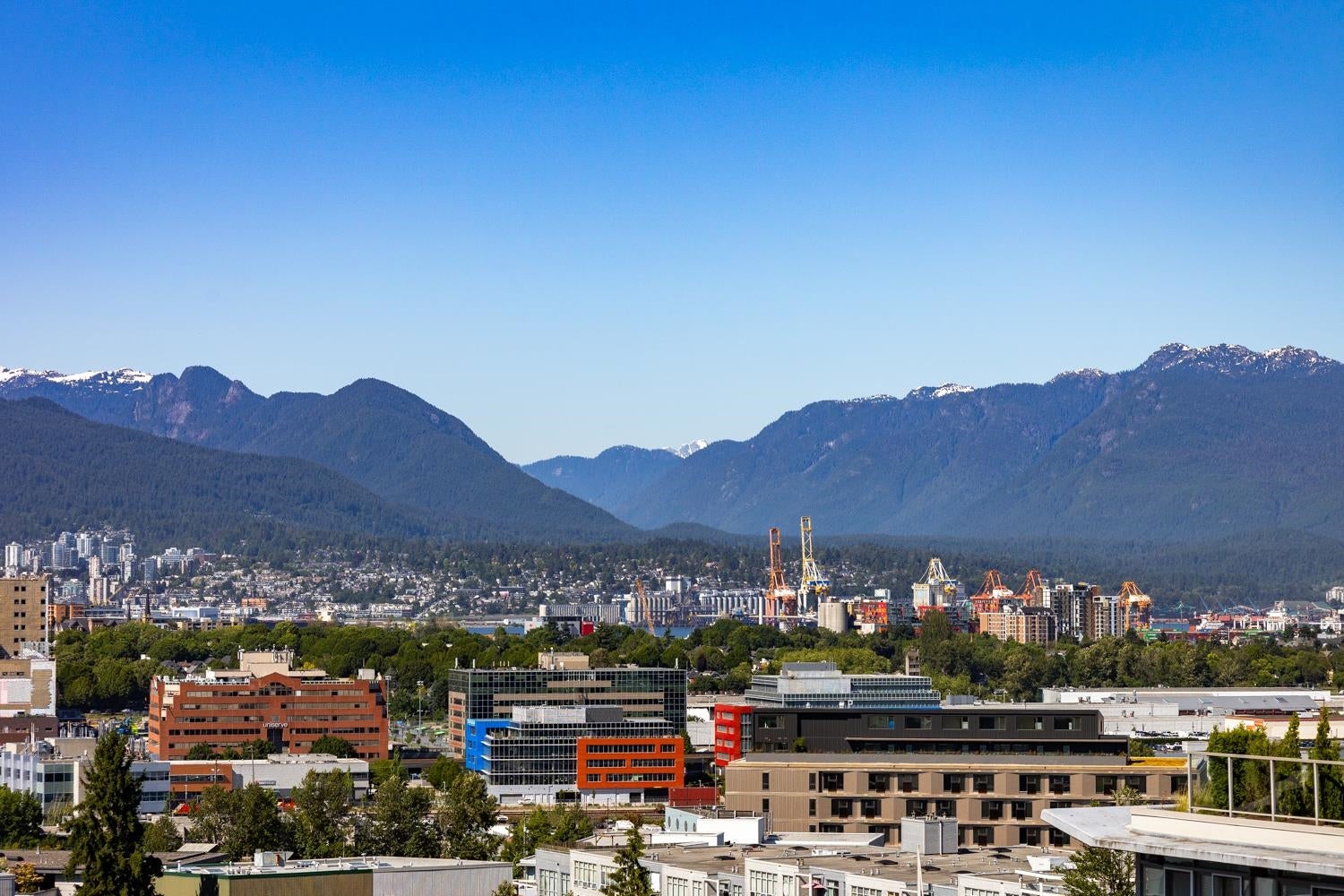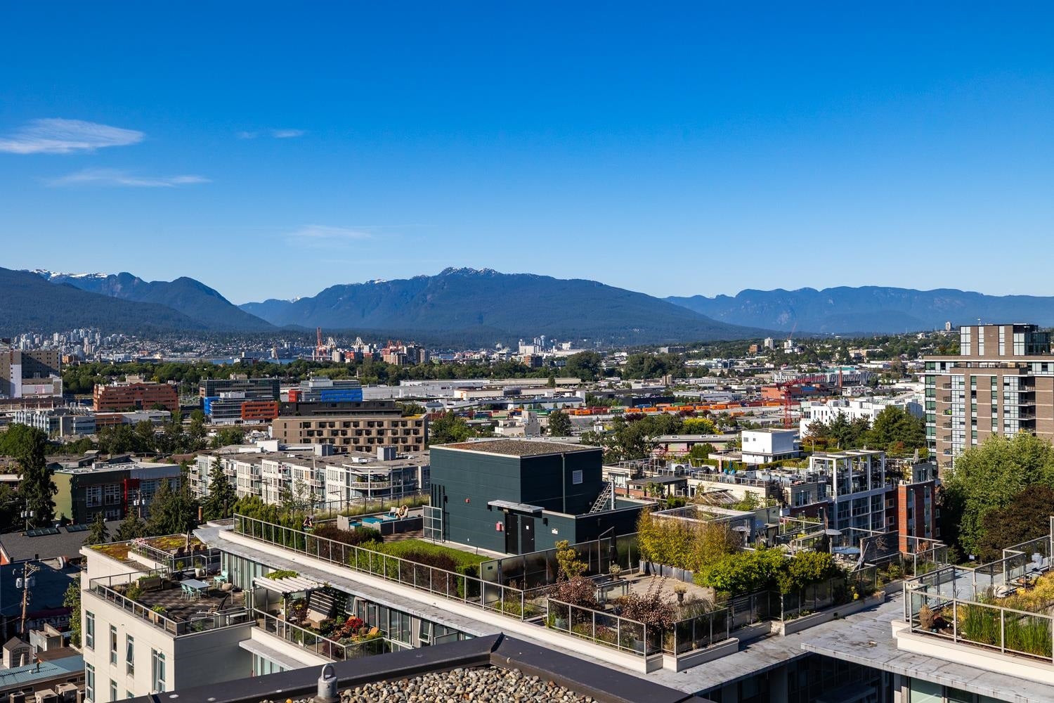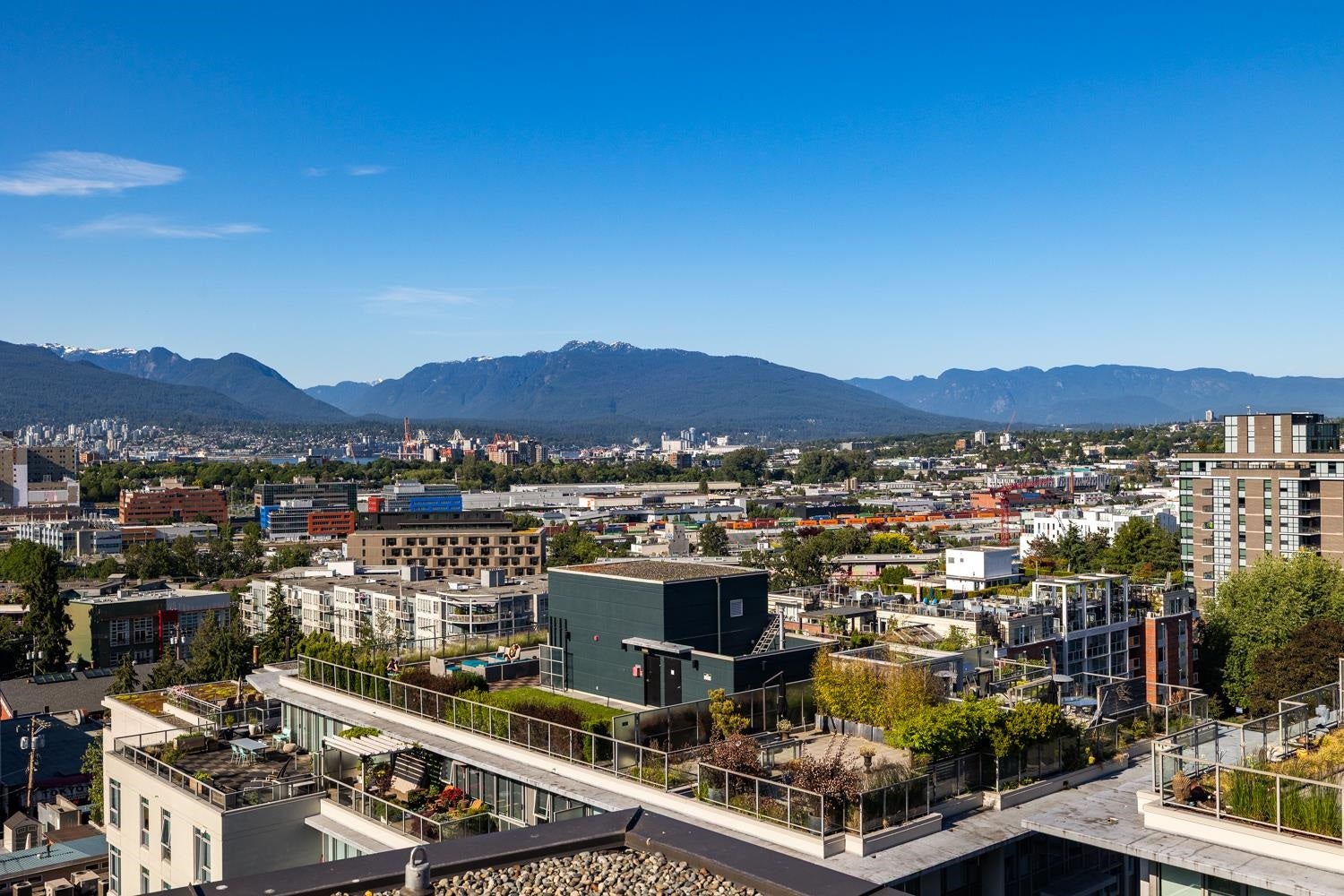 Spectacular views of the North Shore Mountains & City skyline from this beautiful Sub-Penthouse in vibrant Mt. Pleasant! Welcome to Ellsworth, a LEED certified concrete building just steps to Main St, this bright north-facing, open-concept 2 bedroom 2 bathroom+Flex/Pantry home with no wasted space boasts high-end finishings, a kitchen equipped with gas range & integrated Fisher Paykel appliances complimented by quartz countertops. Energy efficient hydronic heating & cooling system plus a Parking Stall & Bike Locker included in this pet & rental-friendly building. BONUS: Private 112 sq.ft. Storage Room. Impressive amenities include a common 3,500 sq.ft. Rooftop terrace with BBQs & fire table, concierge & lounge with pool table & kitchen.