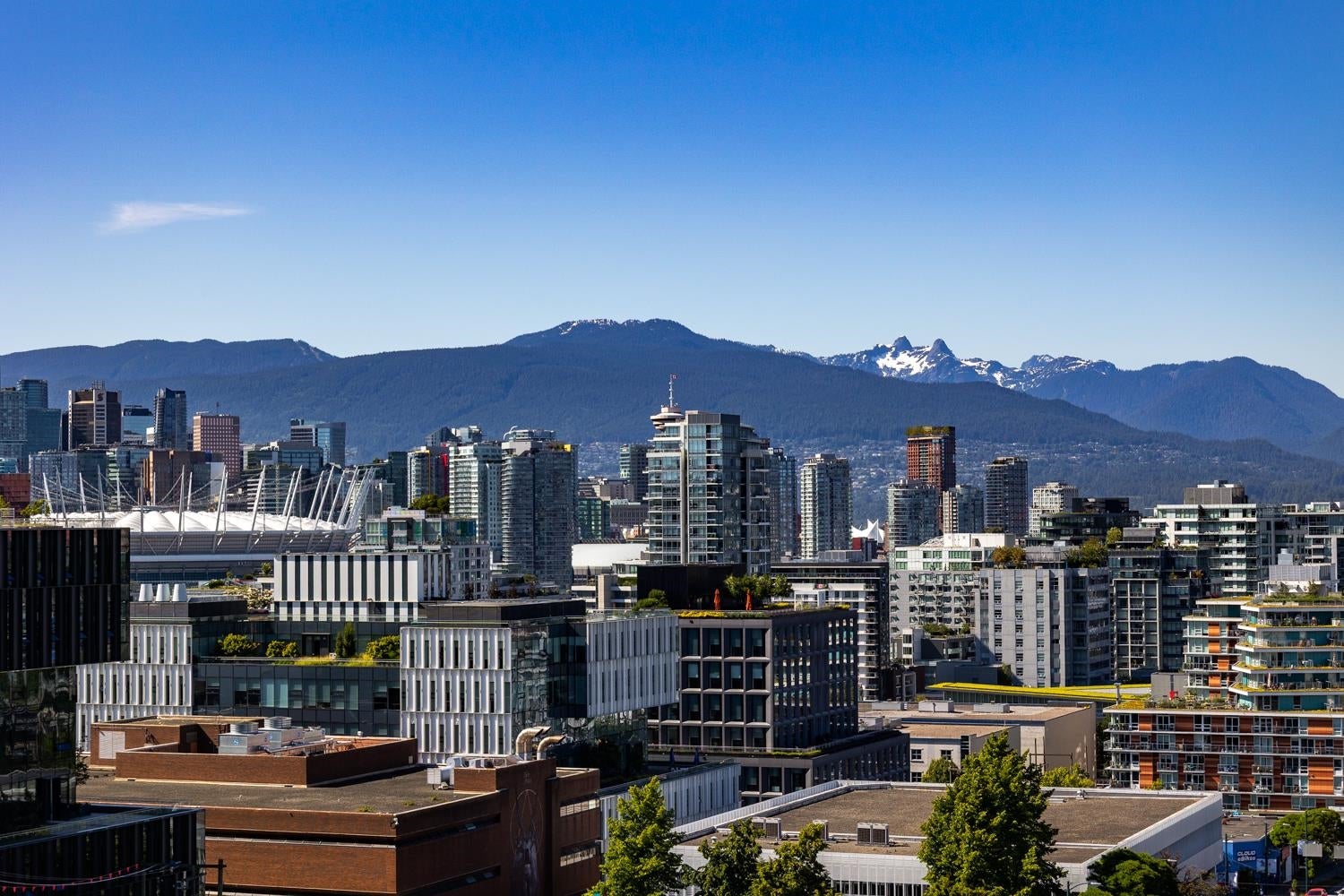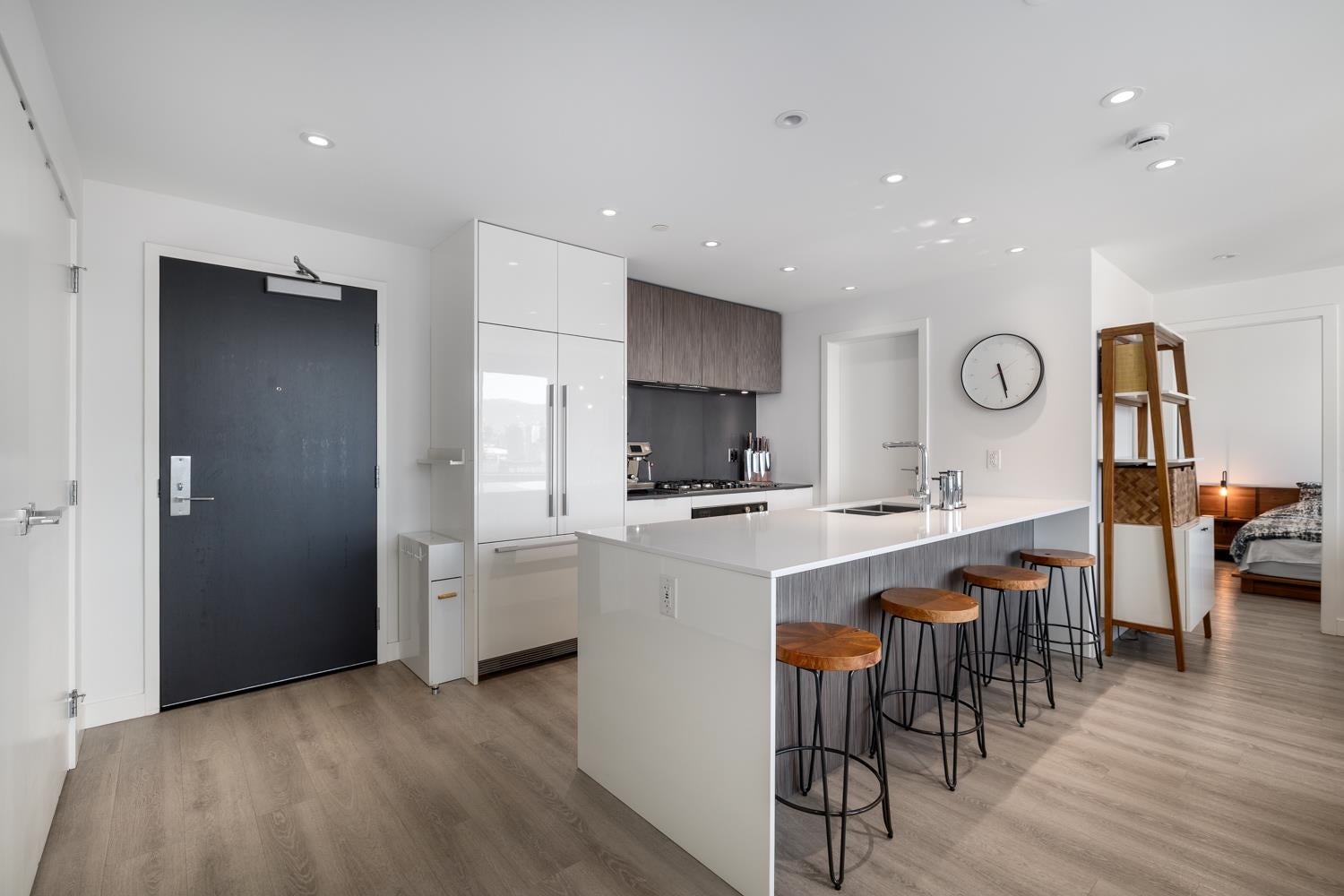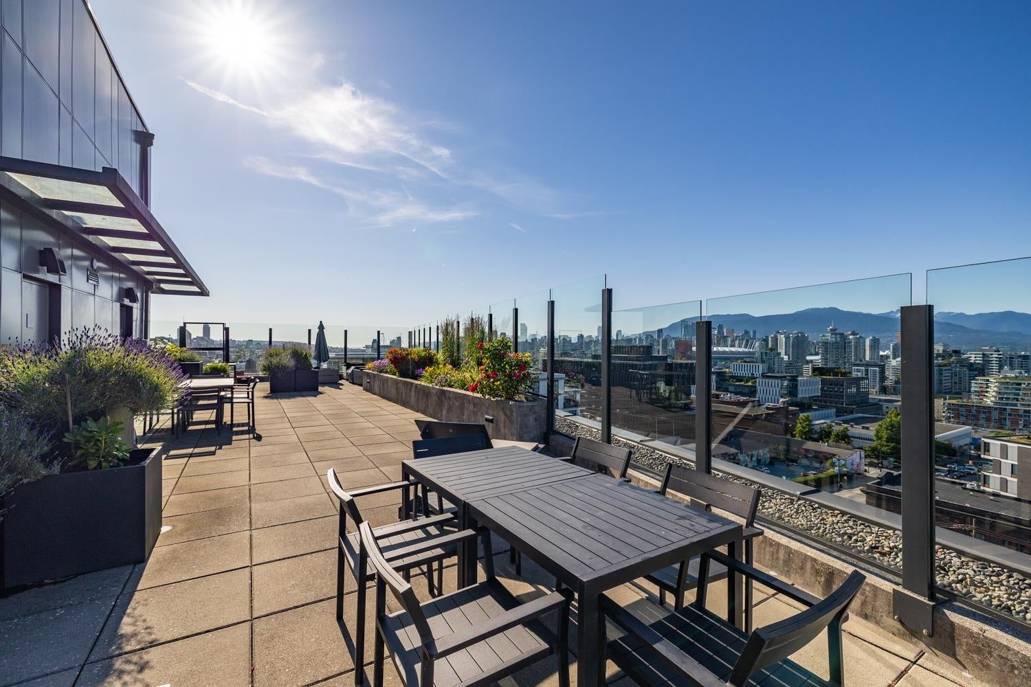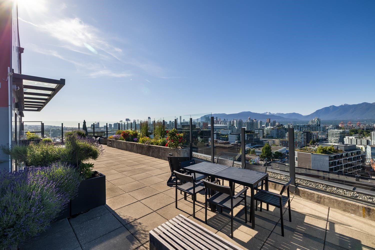 Spectacular views of the North Shore Mountains & City skyline from this beautiful Sub-Penthouse in vibrant Mt. Pleasant! Welcome to Ellsworth, a LEED certified concrete building just steps to Main St, this bright north-facing, open-concept 2 bedroom 2 bathroom+Flex/Pantry home with no wasted space boasts high-end finishings, a kitchen equipped with gas range & integrated Fisher Paykel appliances complimented by quartz countertops. Energy efficient hydronic heating & cooling system plus a Parking Stall & Bike Locker included in this pet & rental-friendly building. BONUS: Private 112 sq.ft. Storage Room. Impressive amenities include a common 3,500 sq.ft. Rooftop terrace with BBQs & fire table, concierge & lounge with pool table & kitchen.